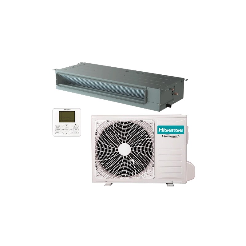 Aire acondicionado conducto ADT52UX4RSCL7 de HISENSE: sistema de climatización invisible de 5,0 kW que consta de una unidad interior ultraplana (19 cm) y una unidad exterior de alta eficiencia. Con clasificación A++, gas R32 y SEER de 7,00, este conjunto ofrece un rendimiento potente y silencioso. Incluye bomba de drenaje de serie y controlador de pared para un confort total.