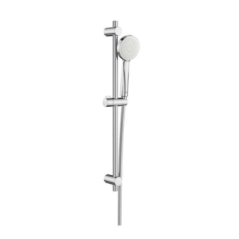 Kit de ducha de mano Stella 100 mm - ROCA con diseño cromado contemporáneo y líneas puras. Incluye ducha de mano Easyclean® de 100 mm, barra deslizante de 700 mm y flexible antitorsión de 1,70 m. Caudal eficiente con limitador integrado.