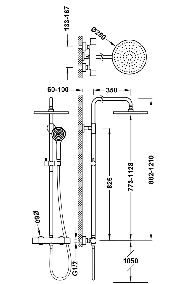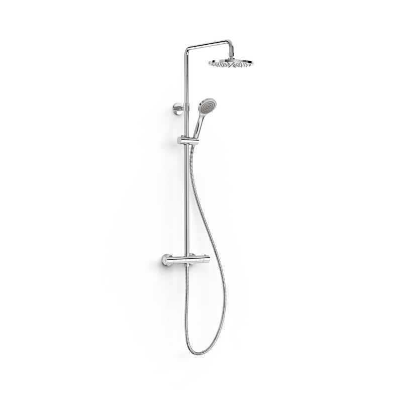 Conjunto de grifo termostático mural de 2 vías para ducha cromo de TRES. Incluye inversor integrado en regulador, barra telescópica, rociador orientable de Ø 250 mm y ducha de mano anticalcárea de Ø 100 mm. Acabado cromo y cuerpo de latón bajo en plomo. Caudal de 12 l/min.