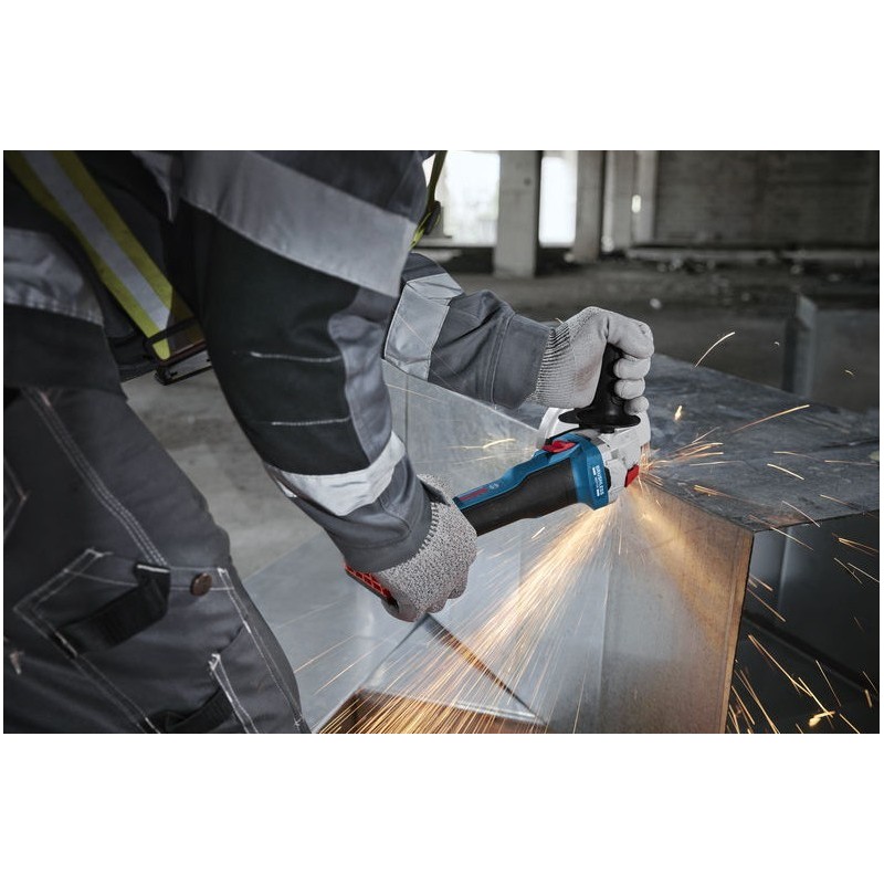 El kit completo incluye: amoladora a batería GWS 18V-8, brida de fijación, tuerca tensora, llave de dos agujeros, empuñadura adicional, caperuza protectora, L-BOXX 136, un cargador rápido GAL 18V-40 Professional y 2 baterías GBA 18V 5.0Ah.