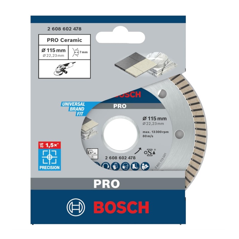 Disco de corte de diamante Pro Ceramic para amoladora de 115 mm de BOSCH: Disco de diamante (115 x 1,4 mm) diseñado para las máximas exigencias. Proporciona cortes exactos y sin roturas a elevada velocidad en materiales extraduros como gres porcelánico, gres y piedra natural. Cuenta con un anillo de corte sinterizado y pastilla de diamante de 7 mm.