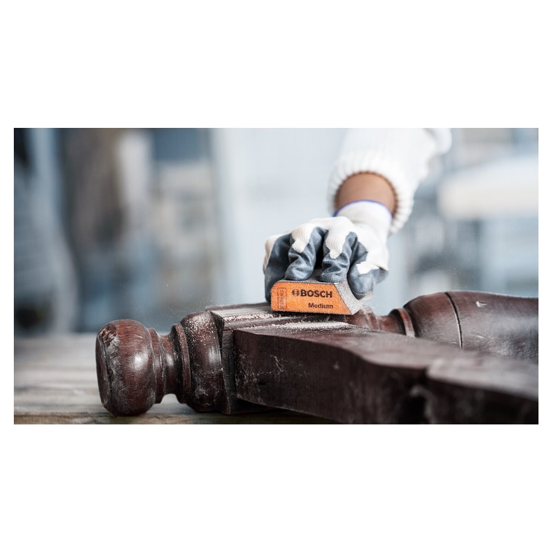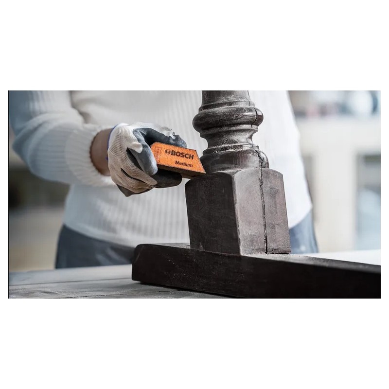 Este taco, con unas dimensiones de 26 x 69 x 97 mm, está diseñado para ofrecer una larga vida útil, superando la durabilidad de las hojas de lija convencionales que se obstruyen o rompen con facilidad. Gracias a la Unión fuerte y flexible con Bosch Surface Structure, garantiza un rendimiento constante y reduce el consumo. La esponja es resistente al desgarro, extremadamente fuerte, y se adapta fácilmente a la forma de la pieza, asegurando una presión uniforme en toda la superficie. Es perfecto para lijar superficies planas y trabajar curvas y bordes de 90 grados. Una vez que pruebes esta revolución en el lijado manual, no querrás usar otra cosa. Se incluye 1 unidad por paquete.