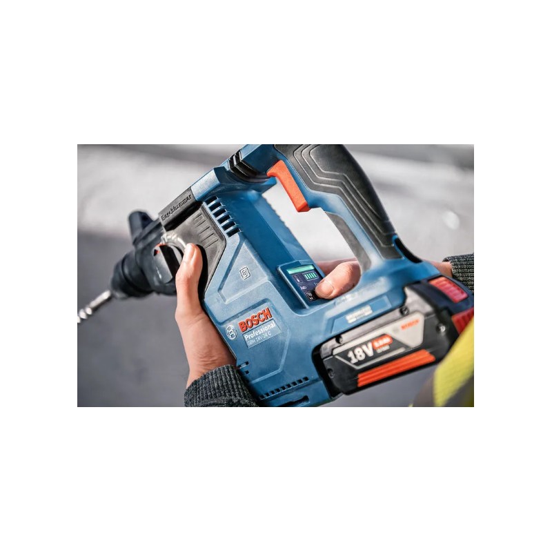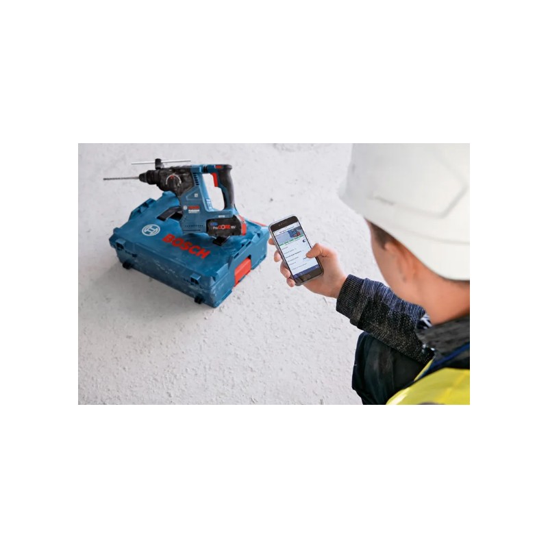 Martillo GBH 18V-24 C L-BOXX 136 de BOSCH: Martillo perforador a batería de 2,4 J con motor Brushless y máxima eficiencia. Presenta pantalla HMI y conectividad Bluetooth para ajustes personalizados. Incluye seguridad total con KickBack Control y Vibration Control y se suministra en L-BOXX 136 para un transporte cómodo y seguro.