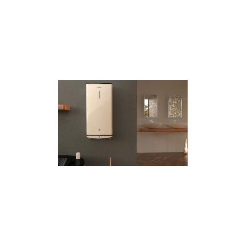 Termo Velis Pro – ARISTON: termo eléctrico plano con doble depósito y resistencias blindadas para un calentamiento más rápido. Instalación vertical u horizontal, función ECO EVO de ahorro energético y pantalla táctil LCD. Disponible en 50, 80 y 100 litros.
