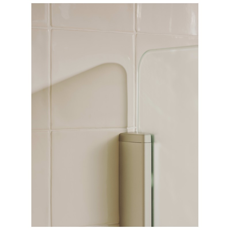 Este modelo está fabricado en cristal templado de tan solo 8 mm, lo que lo convierte en una pieza sólida y segura, sin renunciar a la ligereza y a la modernidad en el diseño. Su acabado serigrafiado mate a una cara proporciona intimidad, mientras que el perfil mural de aluminio en color plata mate añade un toque sofisticado y contemporáneo a la instalación.